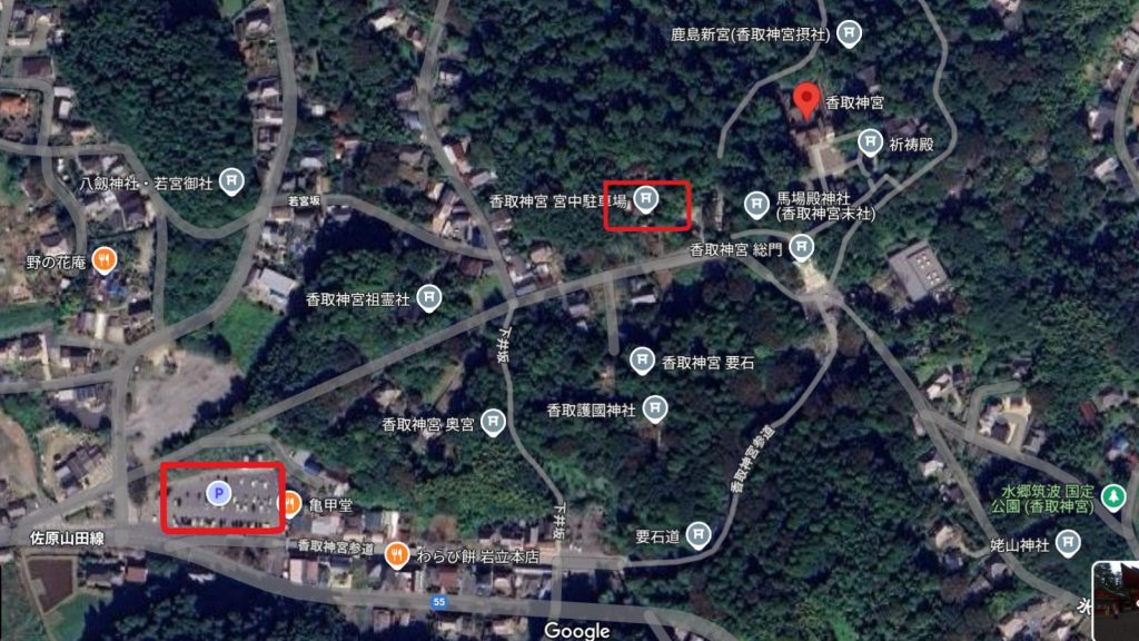 香取神宮へはJR佐原駅からタクシーで約10分、または香取駅から徒歩約30分で到着します。